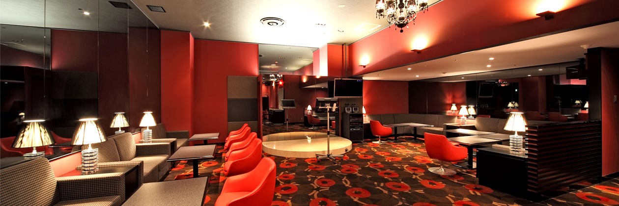 ブラック&レッドのスタイリッシュなバー。 少人数から大人数まで、様々なスタイルでご利用いただけます。