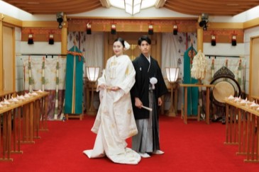 | プランに含まれる内容 | ◎挙式:神官・楽人・巫女・誓詞 ◎衣裳:白無垢(11万円まで)・紋服(9.9万円まで) ◎美容着付:紋服着付・和装着付・かつら・メイク一式 ◎写真:スタジオ写真(クイーンサイズ1ポーズ2枚組) ◎映像:Blu-rayまたはDVD(神前ウェディングロード入場から挙式まで) |